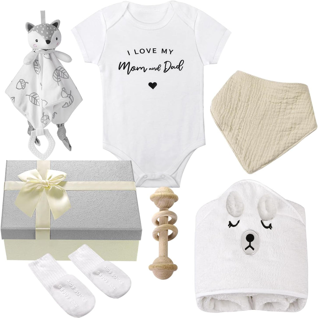 ❤【best Baby Shower Gifts】-Our baby gifts basket includes: 1 * Baby Blanket , 1 * Baby Security Blanket, 1 * Wooden Rattle, 1 * Cute Baby Bibs, 1 * Cute Baby Clothes, 1 * Cute Baby Socks, 1 * Greeting Card, 1 * Luxury Baby Gift Box.