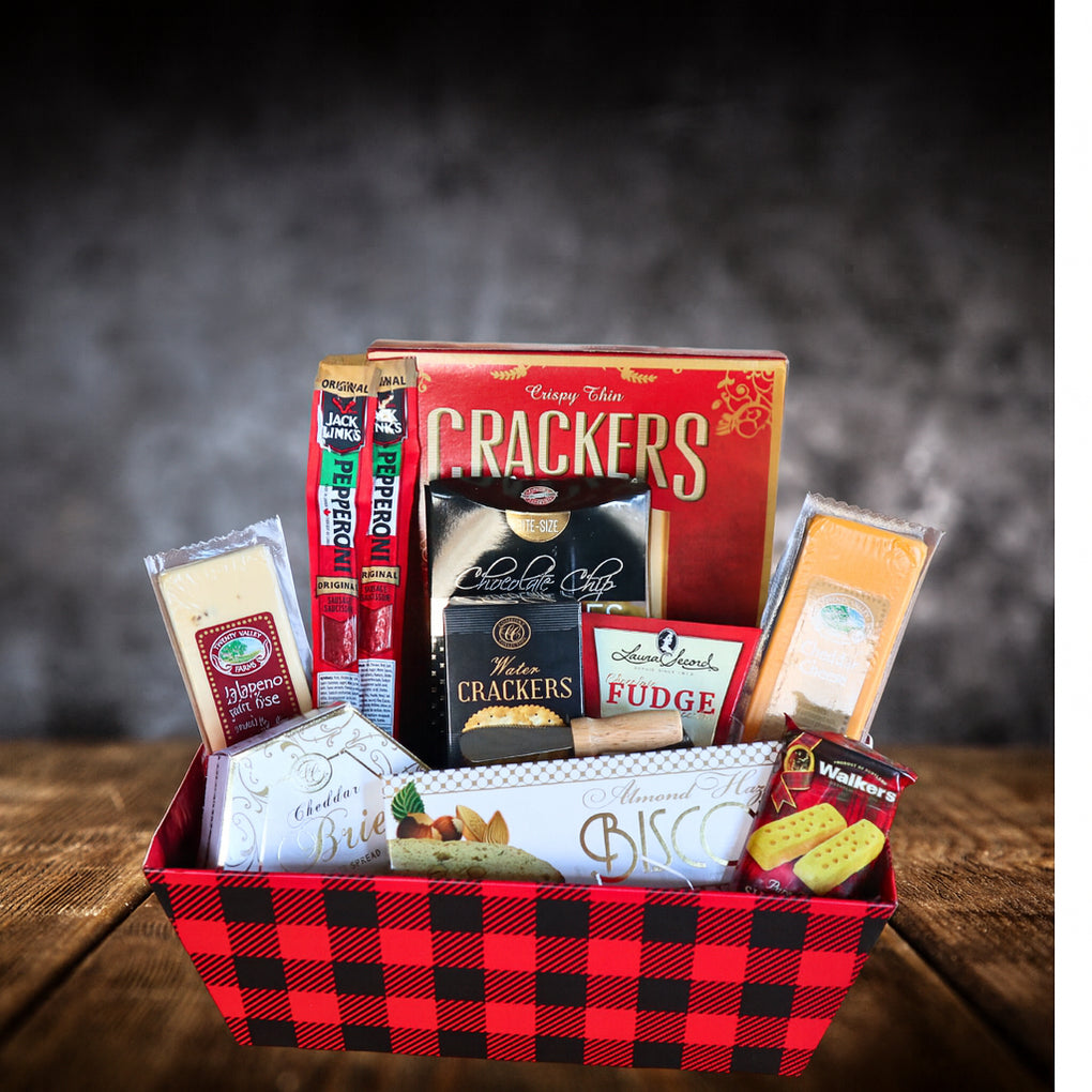 Introducing our "Festive Elegance Wine Gift Basket," a delightful assortment of gourmet treats that is sure to elevate your celebrations. This carefully curated collection is perfect for those who appreciate the finer things in life. Savor the rich, full-bodied notes of the included Red Wine, perfectly complemented by the crisp texture and nutty flavor of Aunt Gloria's Sesame Water Crackers. Explore the bold flavors of Twenty Valley Jalapeno and Cheddar Cheese Bars alongside the creamy Comfort Collection Cheddar Brie Flavored Cheese Spread. Satisfy your savory cravings with two Pepperoni sticks and add a touch of sweetness with the Pirouline Chocolate Hazelnut Cream Filled Wafers, Sonia's Favourite Chocolate Chip Cookies, and Laura Secord Fudge. For a luxurious finishing touch, indulge in the decadence of Lindt Lindor Chocolate, and pair it with Carr's Crackers and Comfort Collection Almond Hazelnut Biscotti. This delightful gift basket comes complete with a mini spreader, making it the perfect choice for sharing, gifting, or elevating your own festive moments. Enjoy the flavors of the season with this Gift Basket.