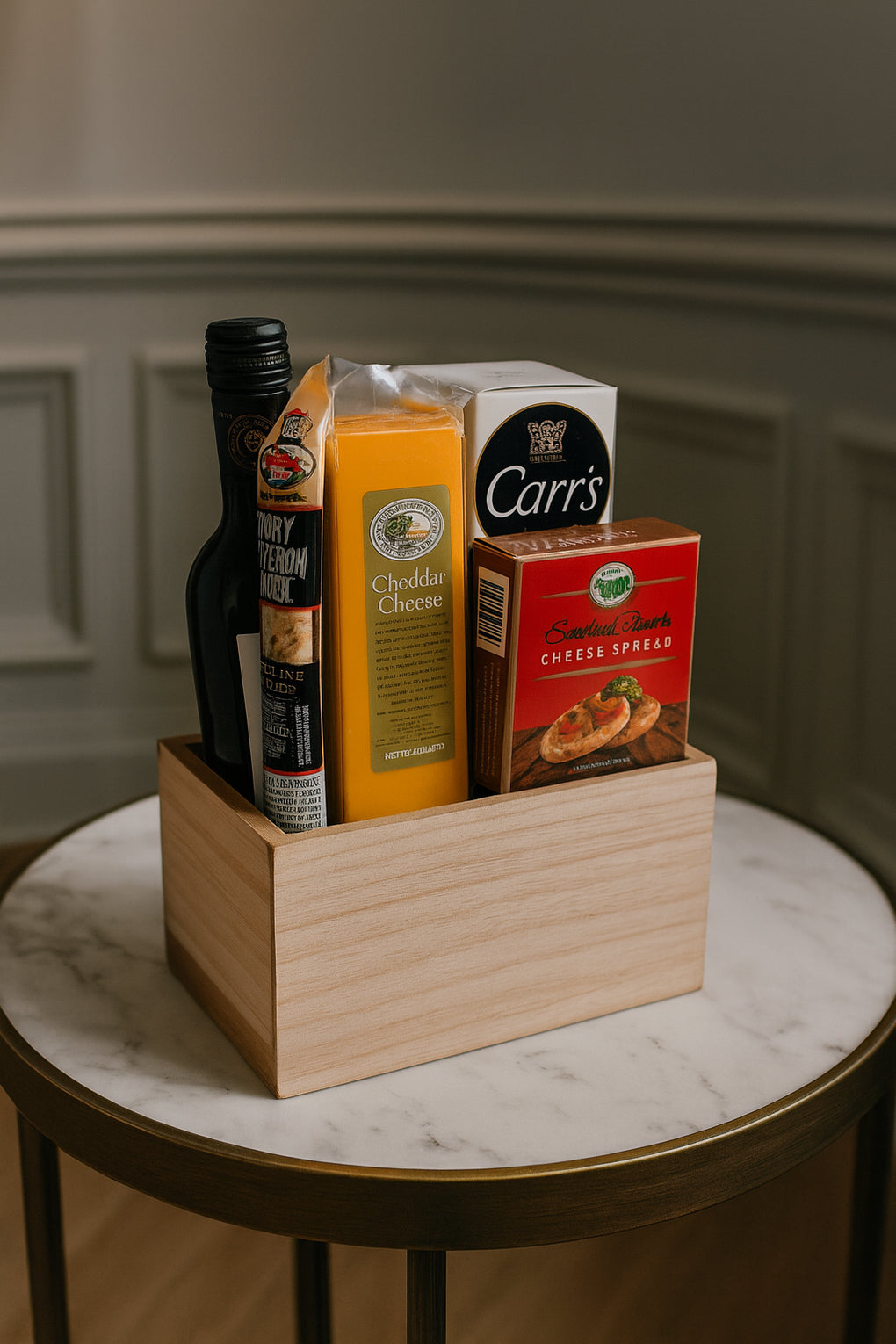 Elevate any occasion with this refined wine and cheese pairing, thoughtfully curated for those who appreciate classic gourmet indulgence. Presented in a stylish wooden crate, this set features a rich bottle of red wine accompanied by Carr’s signature crackers and an assortment of artisanal cheeses from Twenty Valley, including Swiss, Cheddar, and Jalapeño—each crafted to deliver exceptional flavor and quality. A savoury pepperoni stick completes the ensemble, creating a perfect balance of textures and tastes.