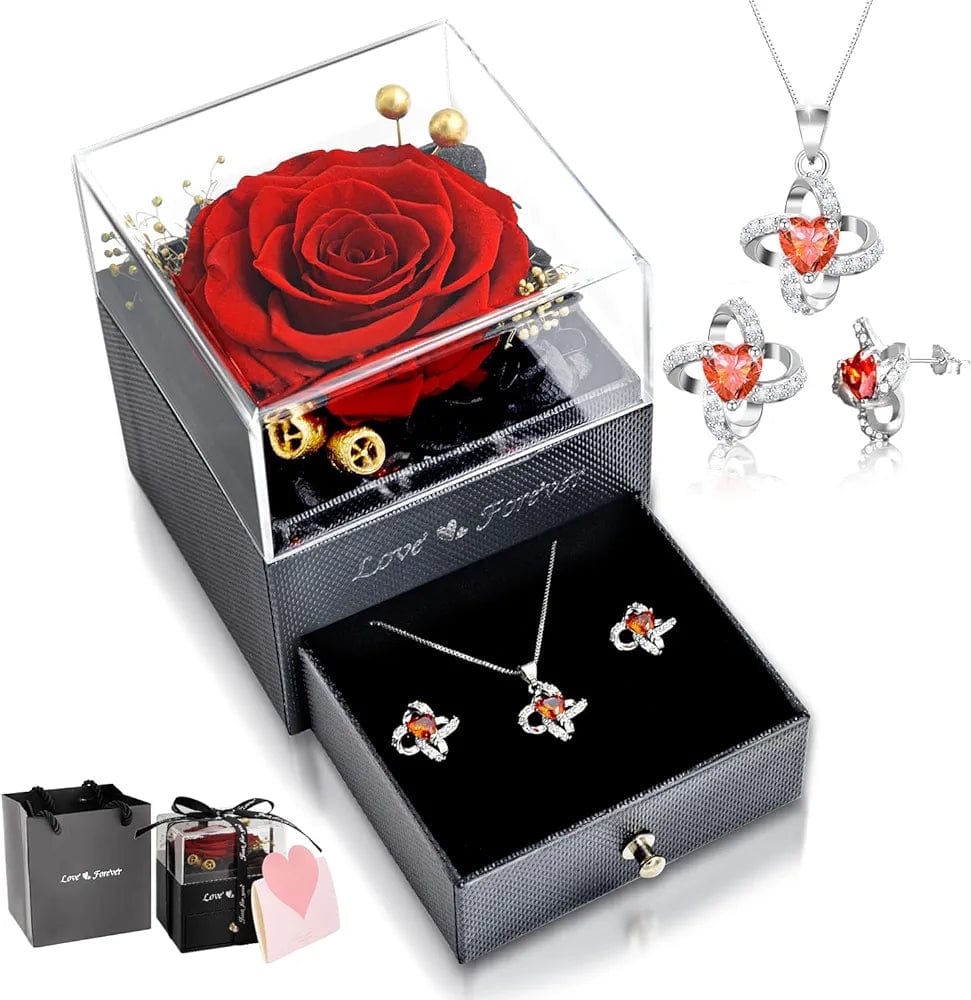 - This preserved rose in glass dome comes with a preserved rose, a pair of fashion earrings, several simulation petals and a heart- shaped LED light. With the exquisite rose gift box, you don’t need to prepare extra gift box.