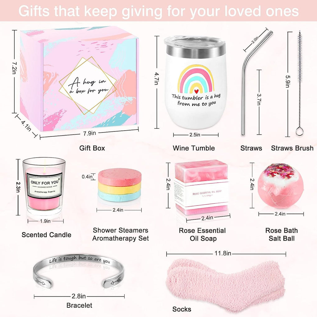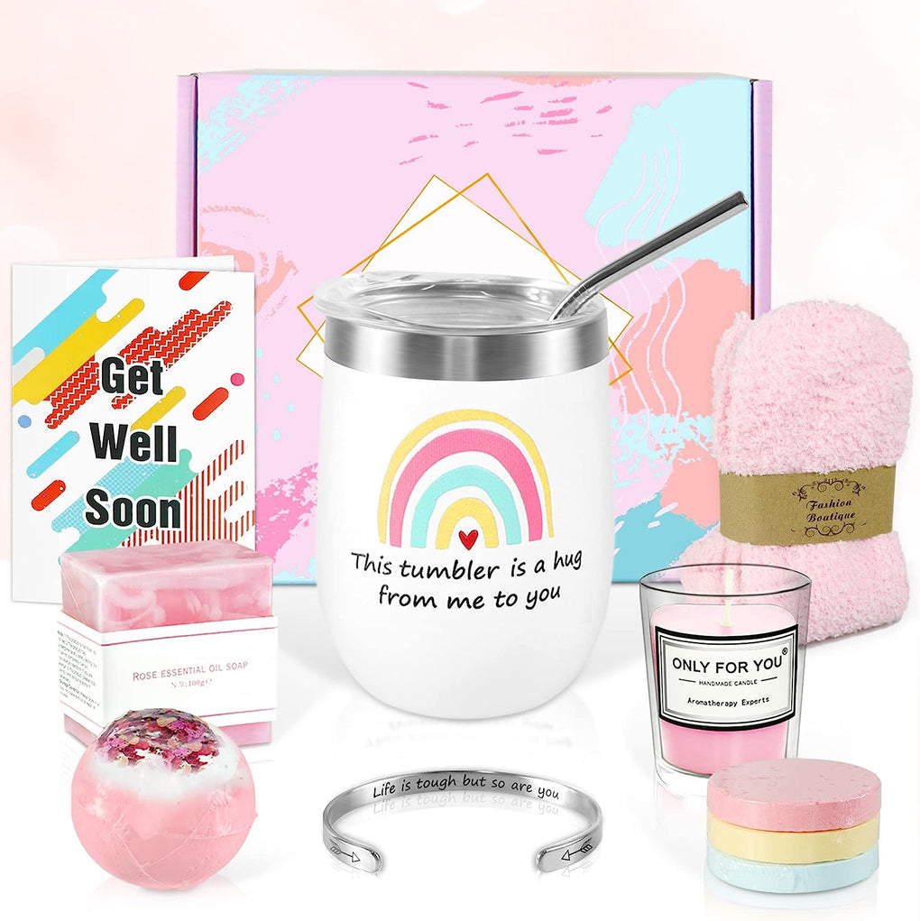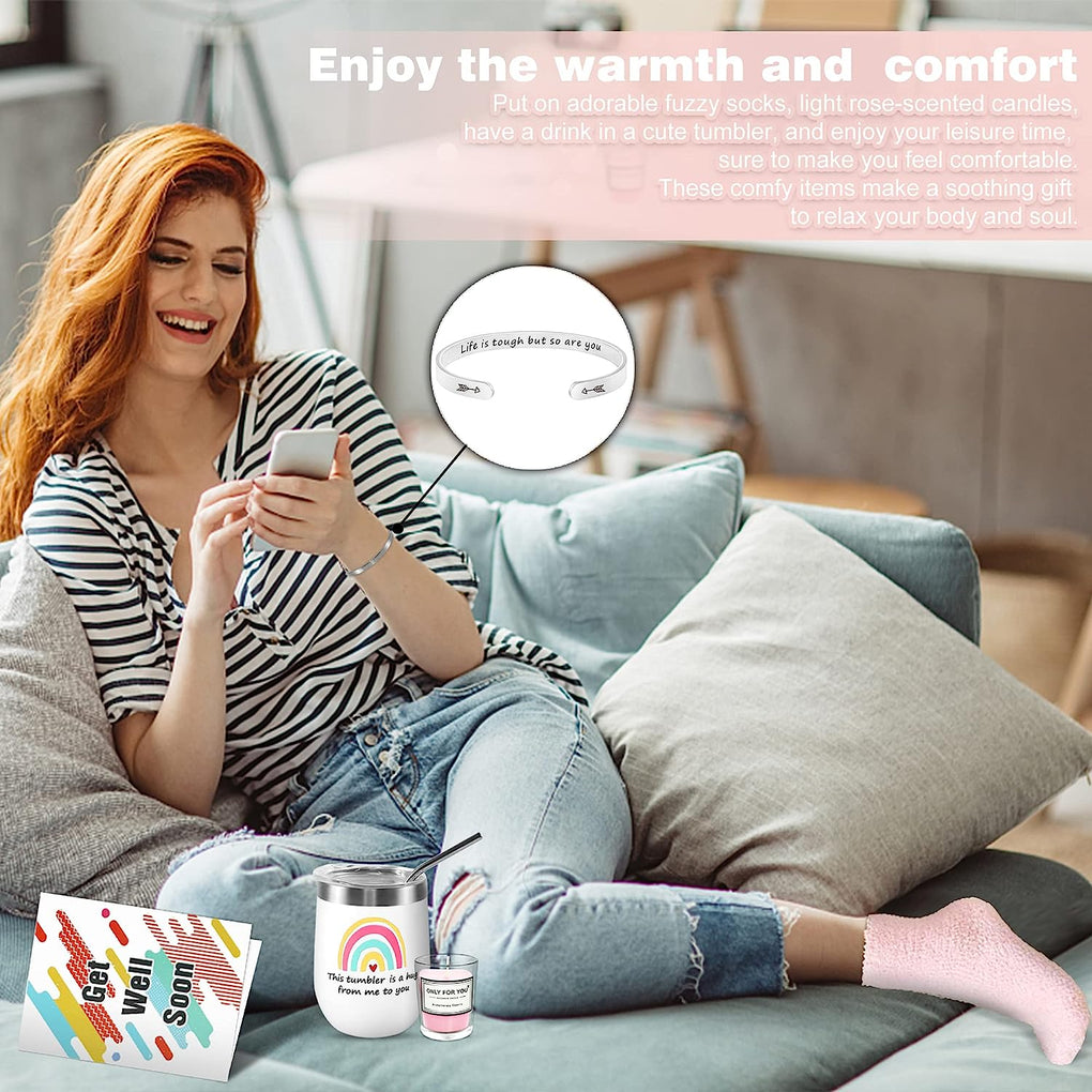 💝Get Well Soon Gifts for Women: Each gift box includes Hug in a tumbler, engraved healing bracelet, scented candle, fuzzy socks, rose essential oil soap, rose bath bomb, shower steamers, get well card, straw, and straw brush. A unique gift for encouragement, support, surgery, keep going, cheer up, sympathy.