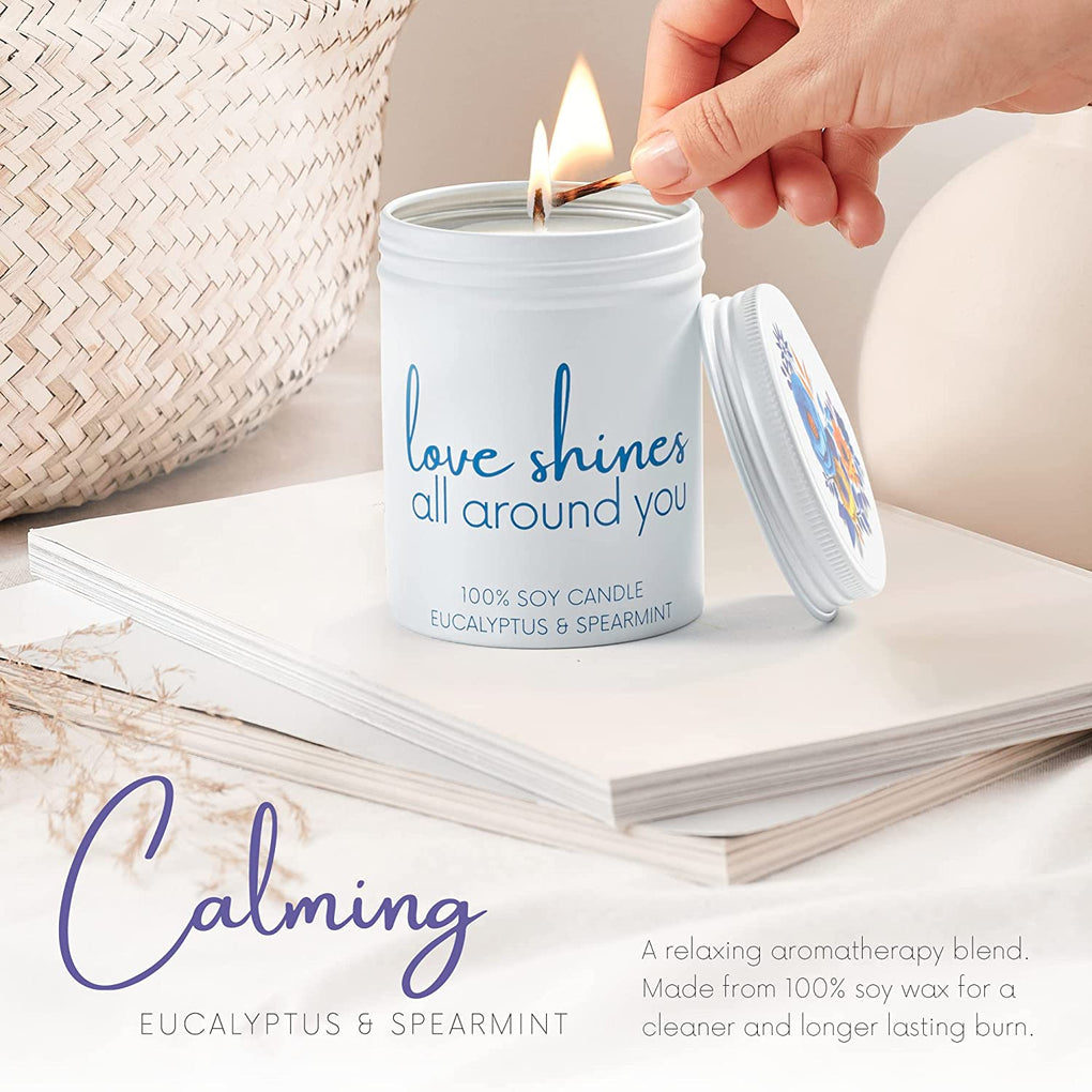 Bereavement box Includes: (1) Forever In My Heart - Ivory Hand Woven Heart Pillow with comforting message (2) Love Shines All Around You - 100% Soy Eucalyptus & Spearmint Candle (3) All Natural Coconut & Almond Scrub Soap (4) Sympathy Card with heartfelt message