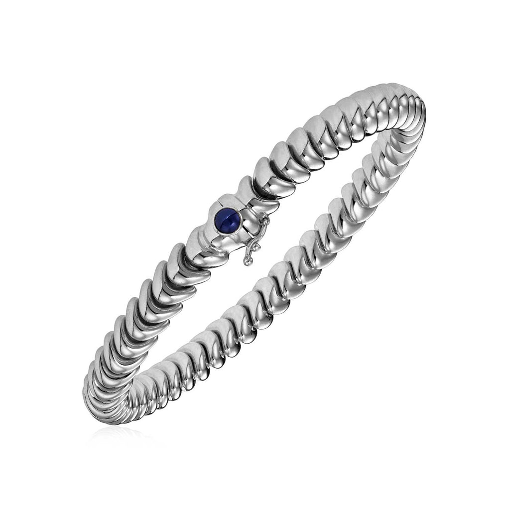An elegant blue sapphire adds a touch of dramatic color to this intriguing 14k white gold dragon link bracelet. Bracelet is 7 1/2 inches long, 6mm wide, and closes with a box clasp.