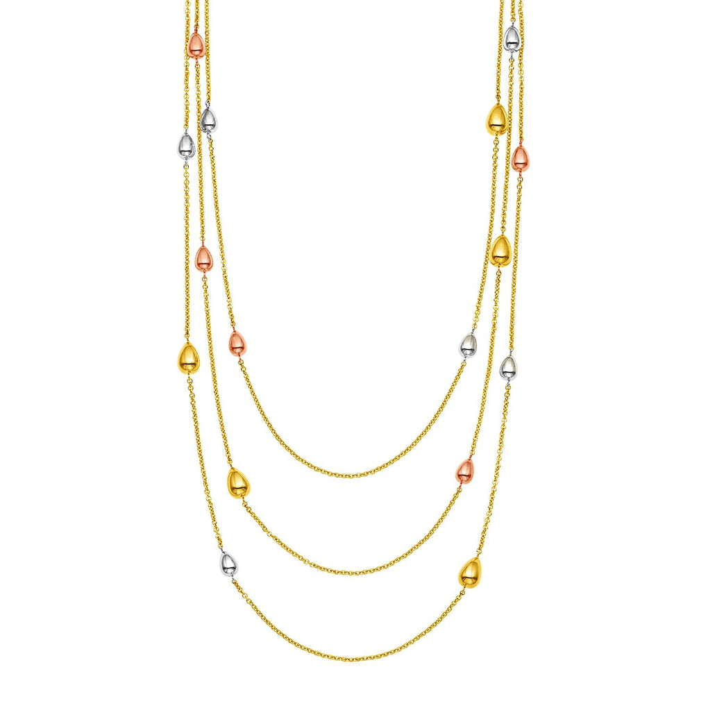 Like water droplets on a spider's web, teardrops of 14k yellow, white, and rose gold cling to delicate chain to form this truly beautiful and unique multi-strand necklace. Necklace is 24 1/2 inches long and closes with a lobster clasp.