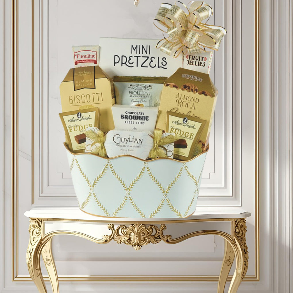 Description: 11 items: Laura Secord Fudge 20g (2 pcs), Brown & Haley Almond Roca Cookies 57g, Pirouline Choc Wafers 25g, Snacktales Mini Pretzels 113g, Pizzaz Fruit Jellies 42g, Aunt Gloria’s Mini Biscotti 57g, Laurieri Cookies 30g, Snacktales Brownie Fudge Thins 42g, Guylian Belgian Truffles 33g, White and Gold Pattern Metal Basket (12’’). GIFT BASKETS ARE DRESSED IN CELLO AND BOW