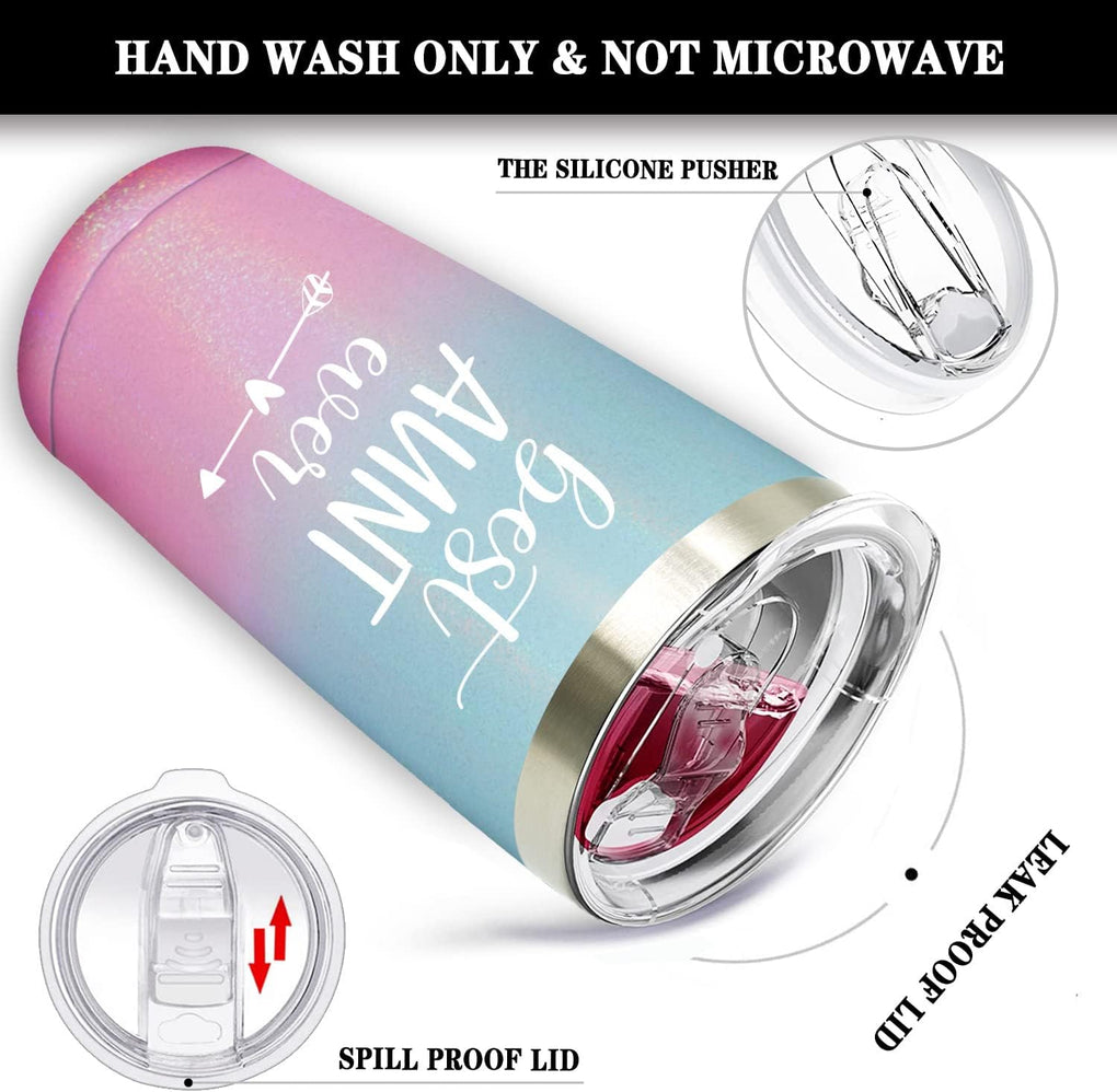 Pr Ready to show your favorite aunt some love? This [Aunt Gifts] tumbler is the perfect way to tell your aunt she's the Best Aunt Ever. Whether it's her birthday or you just want to show some appreciation, this glitter bubble gum tumbler is sure to put a smile on her face. Made from stainless steel, this tumbler is perfect for both hot and cold drinks. It's lightweight and easy to carry, making it perfect for on-the-go aunties. Get one for your aunt today and watch her light up with joy!