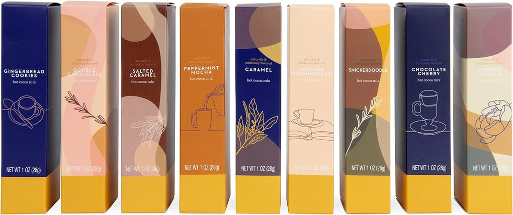 - COCOA VARIETY PACK - USA hot chocolate set includes 9 uniquely flavored cocoa mixes in gift packaging