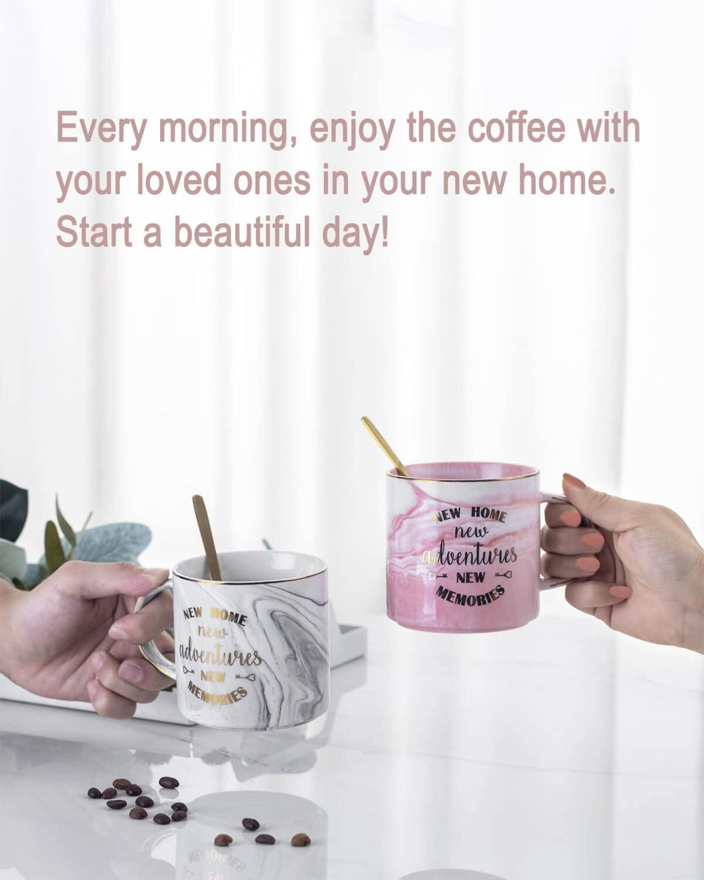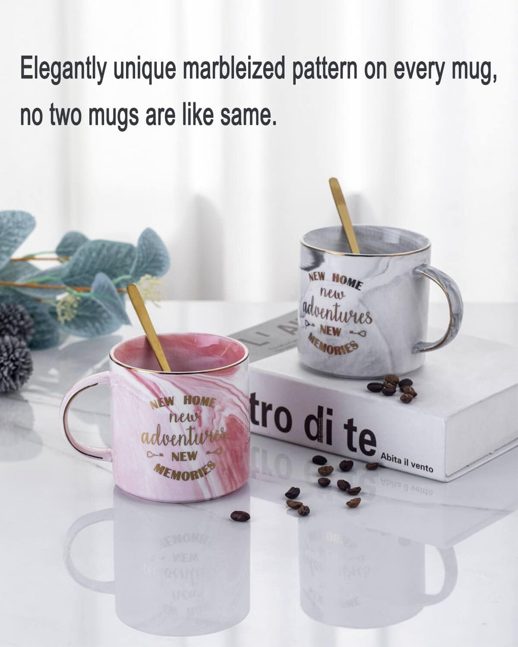 ♕Experience the elegance of our New Home New Adventure New Memories gift box, featuring two exquisite marble-patterned mugs and two stunning golden coffee spoons. These mugs, adorned with the empowering phrases “New Home New Adventure New Memories,” exude sophistication and style. The intricate marble design adds a touch of luxury to your daily coffee ritual, while the golden coffee spoons lend a hint of glamour. Elevate your mornings and evoke the spirit of new beginnings with this perfect housewarming gift for new homeowners.