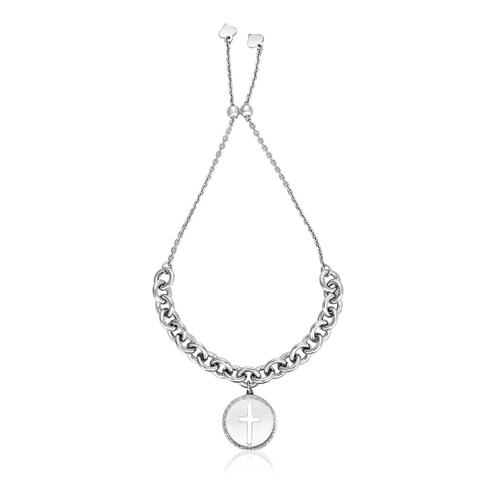 Bold, polished links of chain are joined with a glorious round cross charm in this adjustable sterling silver bracelet. Bracelet is 9 1/4 inches long and adjusts with a draw string clasp.