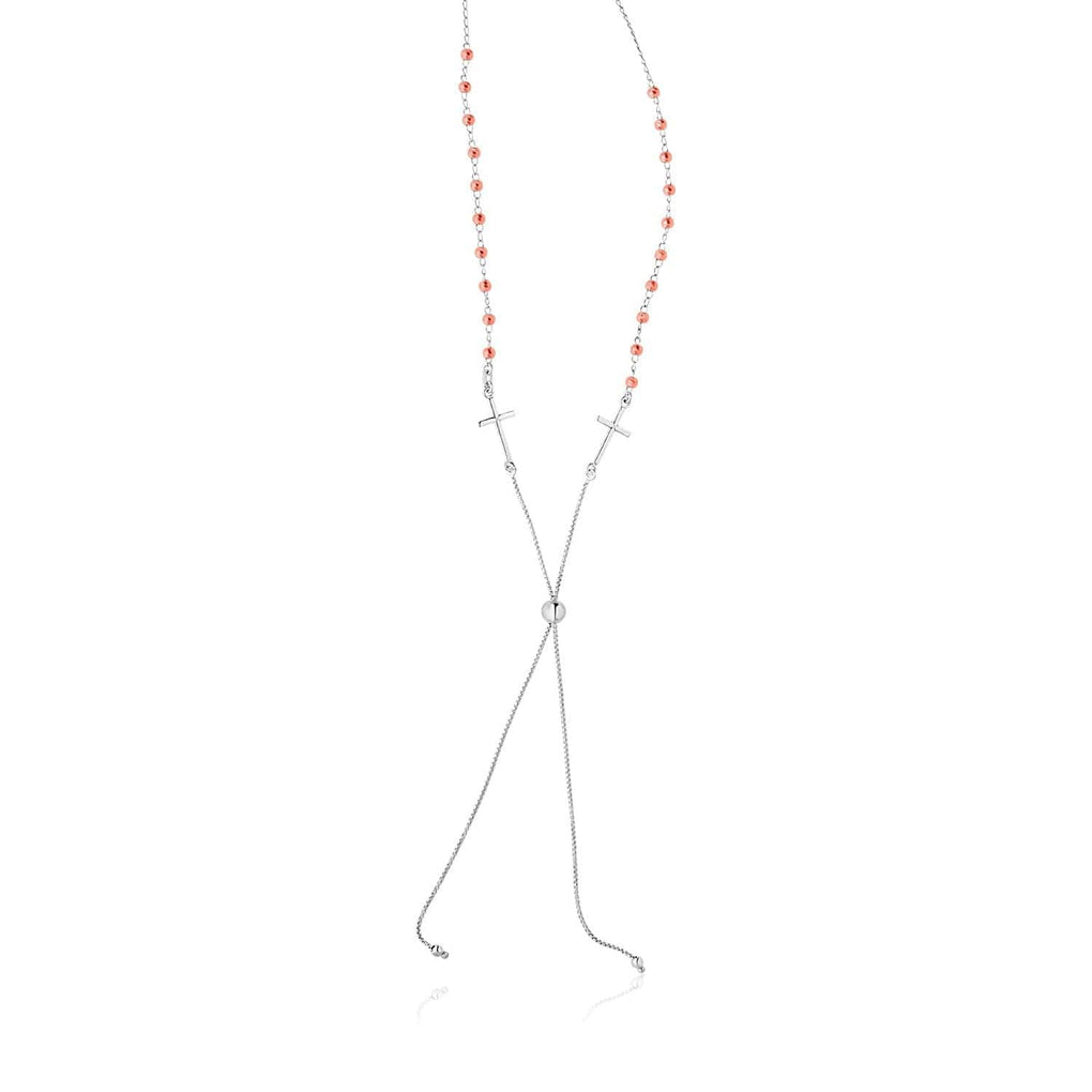 Polished crosses and rose-finish beads adorn this stunning sterling silver lariat necklace. Lariat necklace is 28 inches long and adjusts with a draw string clasp.