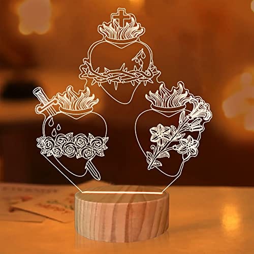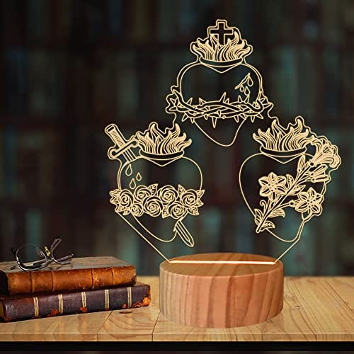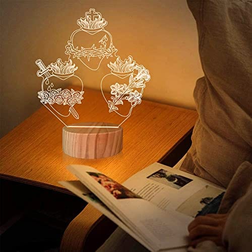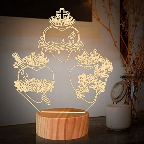 • ❤️ HIGH-QUALITY❤️ The 3D lamp base is made of high-quality pine wood materials, lightweight and robust, without a pungent smell, and without sharp edges. The three sacred heart night light is made by 3d laser engraved technology to create a 2D gorgeous optical amazing visual. In fact, it is a 2D acrylic plate with laser-engraved lines.