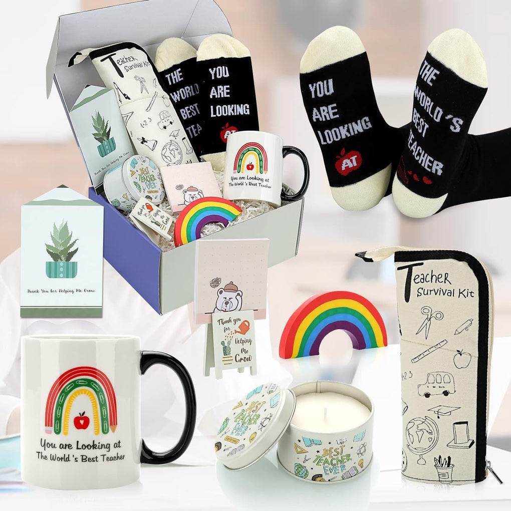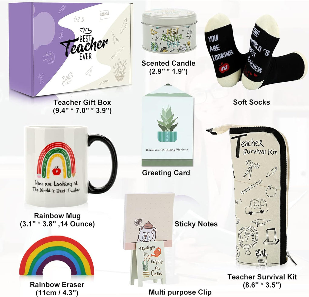 🎁🎁8 Pieces Teacher Appreciation Gift Box - 14 oz Ceramic Mug, teacher survival kit, scented candle, soft socks, sticky notes, multi purpose clip, rainbow eraser and greeting card. 8 pieces teacher stuff are packaged in a gift box, which perfectly meets all needs of your teachers