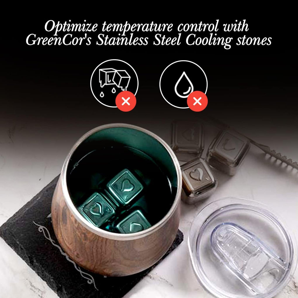 GREAT GIFT SET FOR WINE LOVERS - Your Girl can enjoy her favorite drink without the dilution that comes with using ice cubes! GreenCor’s Stainless Steel “Ace of Hearts” stones offer optimal temperature control and do not melt like traditional ice cubes! This set consists of 2 Large Wine Tumblers , 12 Oz, 8x Stainless Steel (Ace of Hearts) Stones , A Velvet Bag & Vintage Slate Coasters