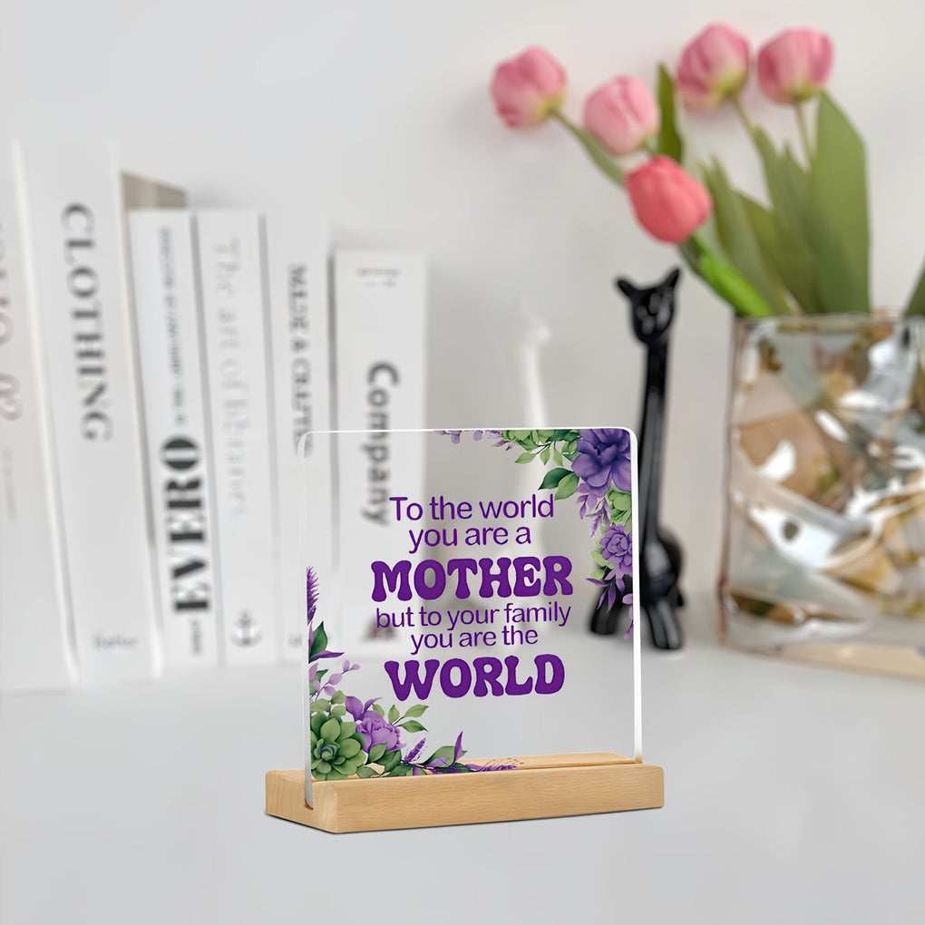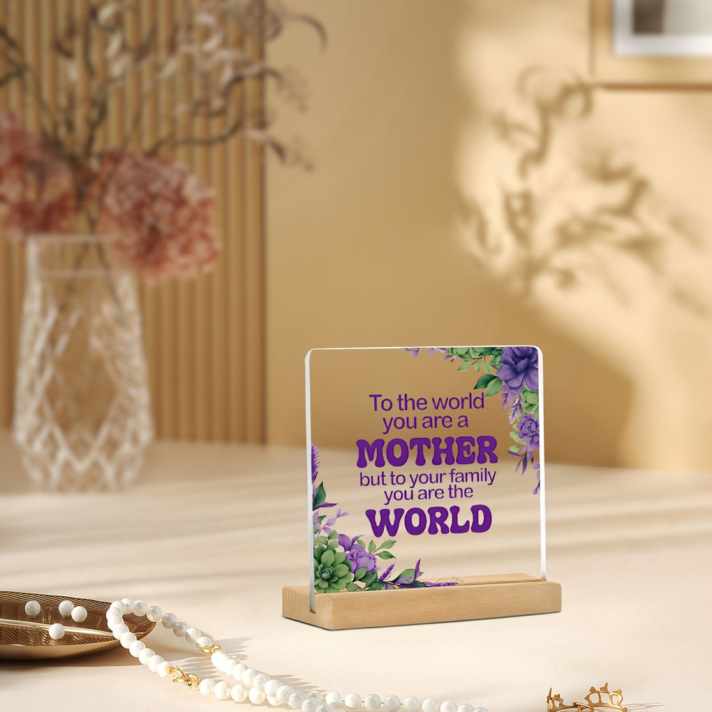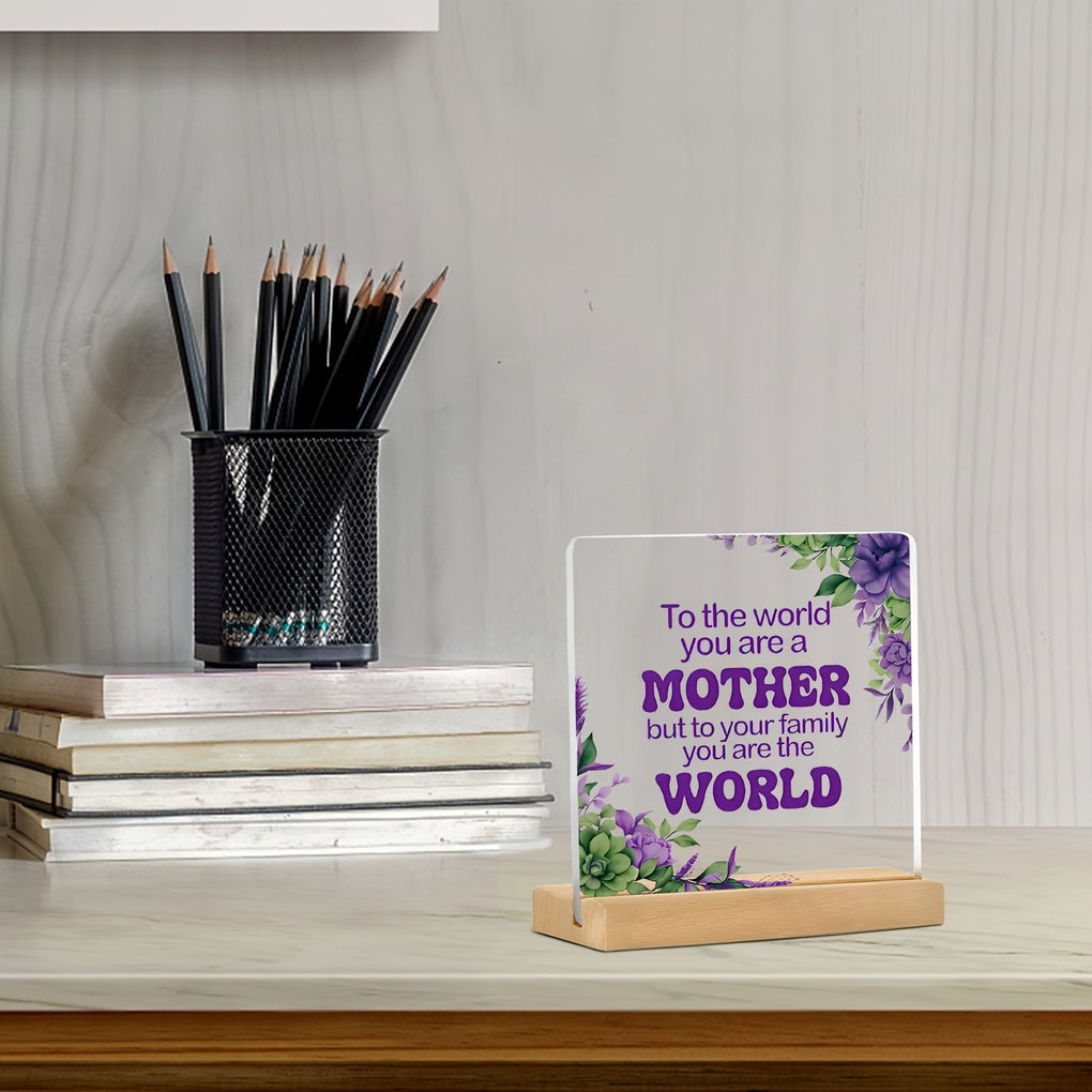 Celebrate the special place mothers hold in our hearts with this exquisite 2D Flat Contemporary Acrylic Sign. Beautifully crafted with a heartfelt message, "to the World You Are a Mother But to Your Family You Are the World," this piece serves as a poignant reminder of the love and appreciation that every mom deserves.