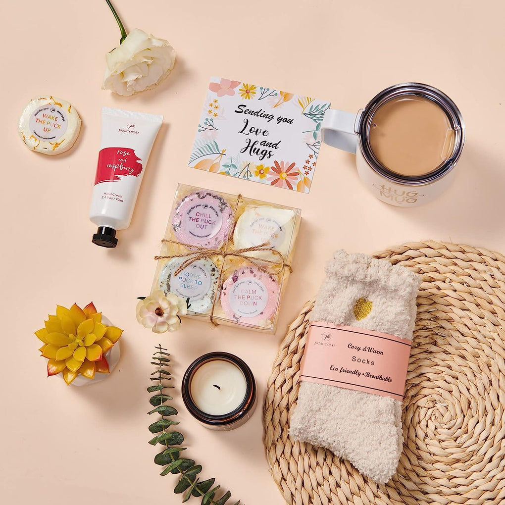 - STRESS RELIEF SPA GIFT SET FOR HER - Help your loved ones relax in these tough times with our spa care package. Sip coffee, light candle, and enjoy a shower with our rejuvenating shower steamer to relieve stress and promote relaxation. Soft fuzzy socks and a mini succulent add an extra touch of love and comfort.