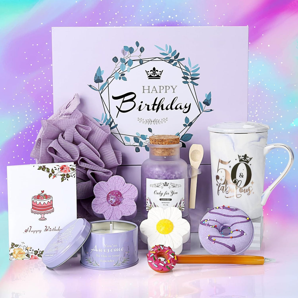 🎁【An Unforgettable Unboxing】Arrives completely assembled in a high quality.Include:1)15oz Purple Mug with lid printed with Birthday Queen; 2)Soy Lavender Scented Candle(printed with You're Awesome, So this is your Reminder, 7oz); 3)Lavender Donuts Bath Bomb(3.52oz); 4)Lavender Flower Bath Bomb(3.52oz); 5)Cotton Candy Flower Bath Bomb(3.52oz); 6)Lavender Salt(9.87oz);7)Donuts Pen;8)Birthday Card; 9)Luxury Birthday Box; 10)Ribbon(81 inch);11)Double-sided Bath Shower Loofah Sponge
